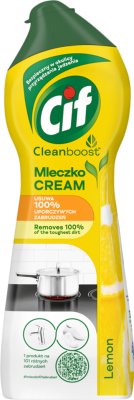 Cechy:Mleczko Cif Cream Lemon usuwa 100% domowych zabrudzeń: przypieczony tłuszcz, przypalone jedzenie czy kamień w łazience, Środek Cif jest bezpieczny w okolicy przyrządzania jedzenia, więc sprawdzi się nie tylko do łazienki, ale i do kuchni, Opakowanie wykonano w 50% z plastiku z recyklingu, a dążymy do tego, by nasze środki do czyszczenia były całkowicie ekologiczne i miały opakowania wytworzone w 100% z recyklingu, Mleczko do czyszczenia Cif zawiera tylko składniki czyszczące pochodzenia naturalnego i pozostawia po sobie świeży, cytrusowy zapach, Dzięki formule Cleanboost mleczko wymaga mniej spłukiwania, ale zapewnia tę samą, uniwersalną moc czyszczenia dzięki naturalnym składnikom czyszczącym, Mleczko Cif Cream Lemon to element naszej walki o czystszą i świeższą przyszłość